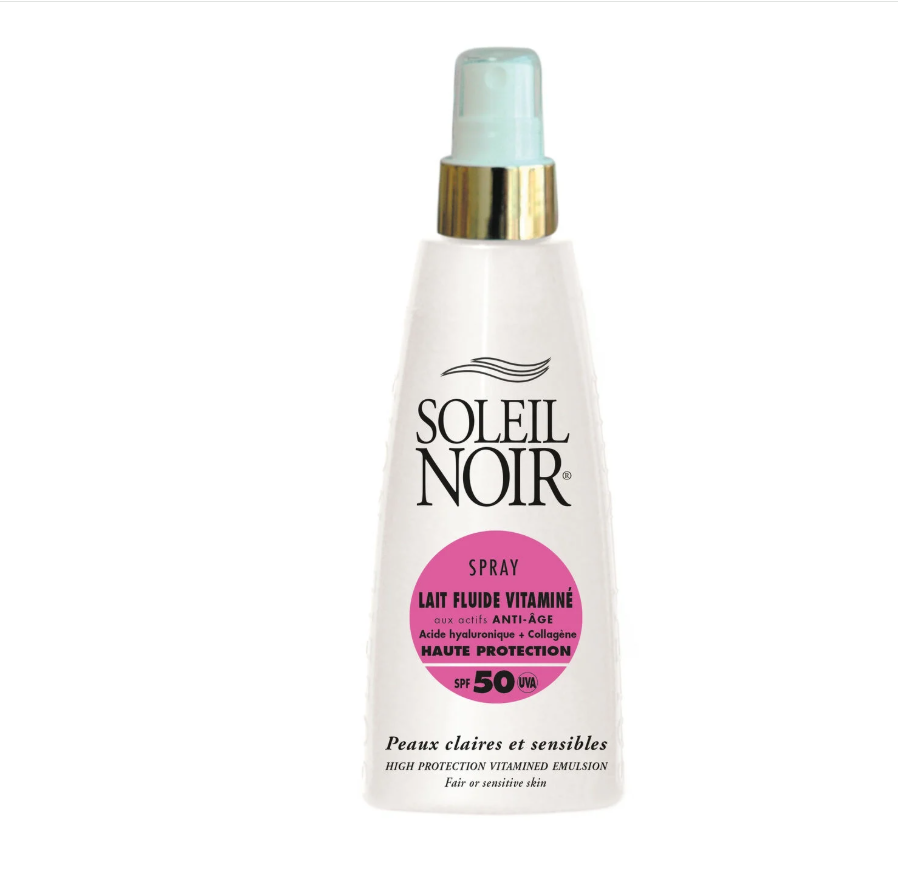 Soleil Noir Spray Lait Fluide Vitaminé SPF 50 150 ml est un lait haute protection adapté aux peaux claires et sensibles.