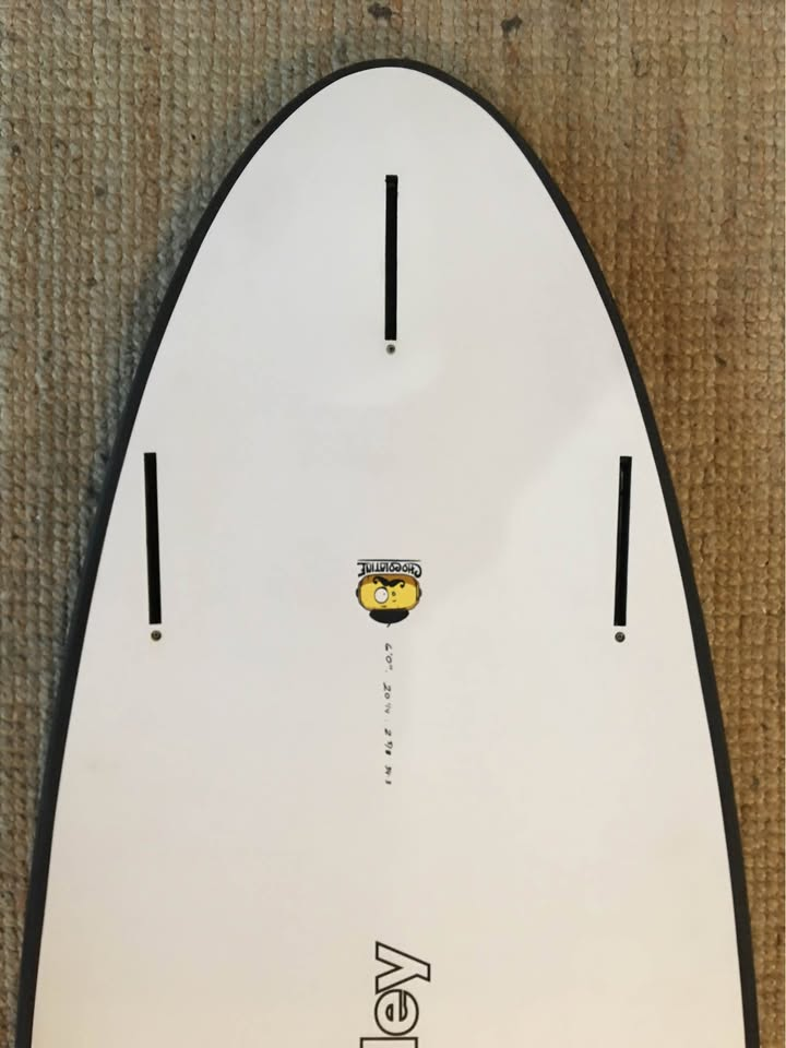 Planche surfée, avec enfoncements d'usage et réparations mineures