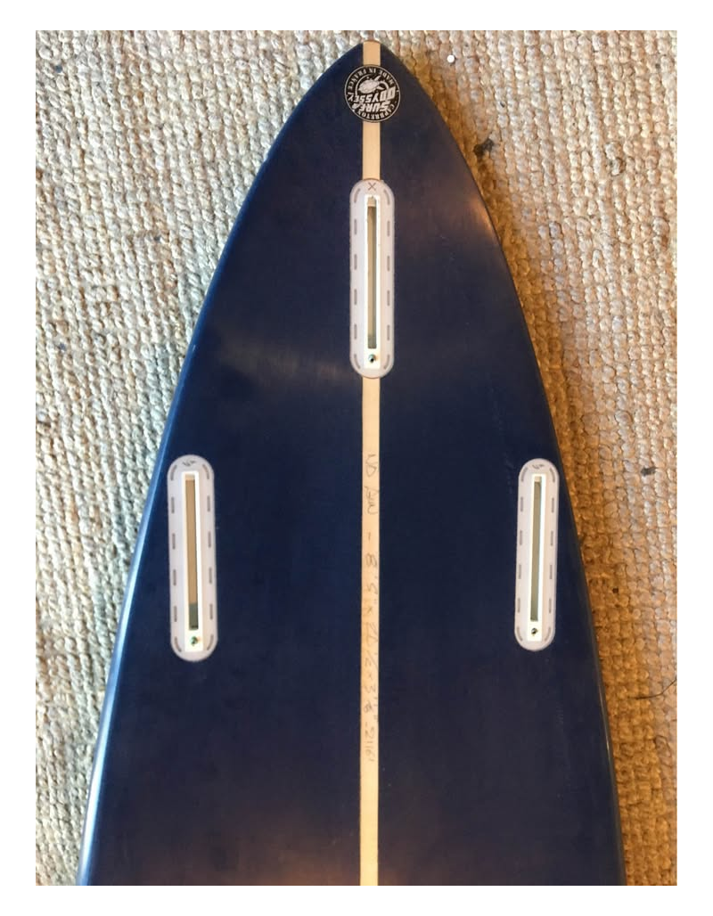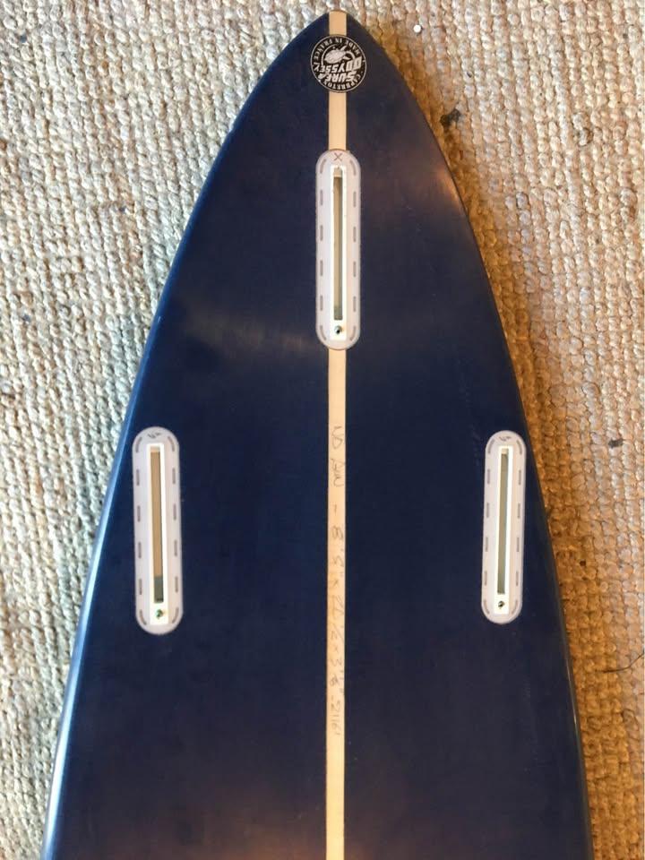 Planche surfée, avec enfoncements d'usage et réparations mineures