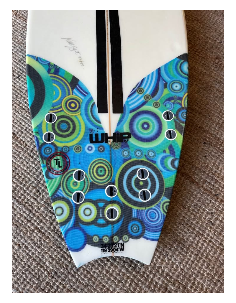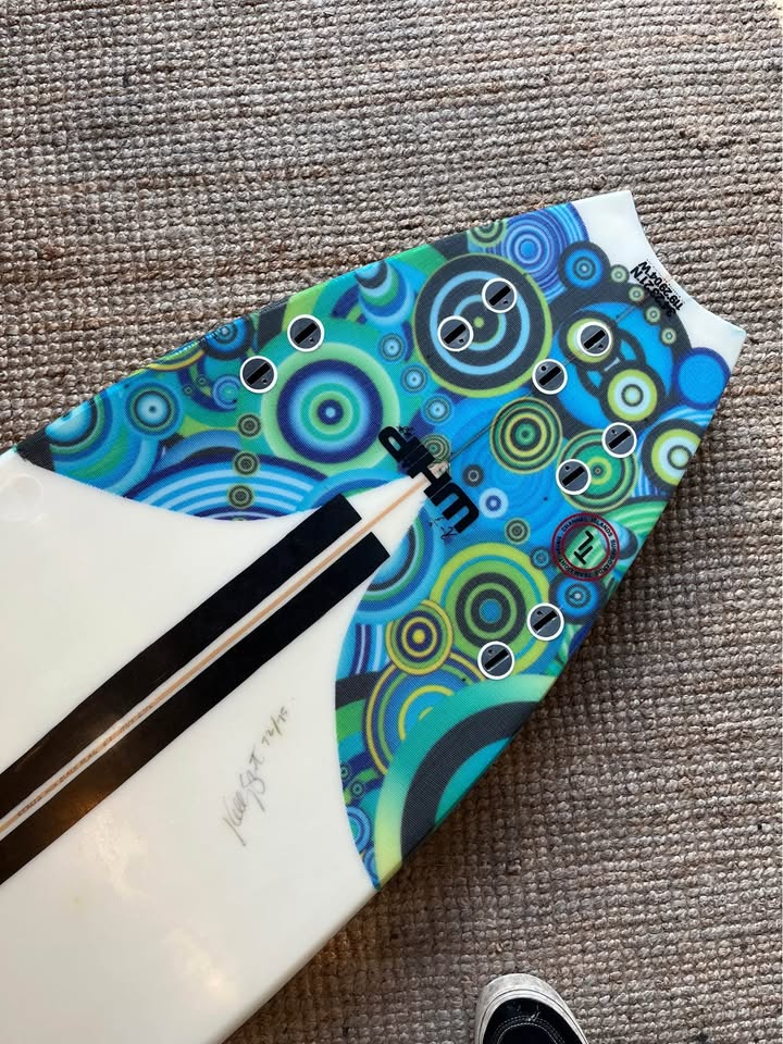 Planche surfée, avec enfoncements d'usage et réparations mineures