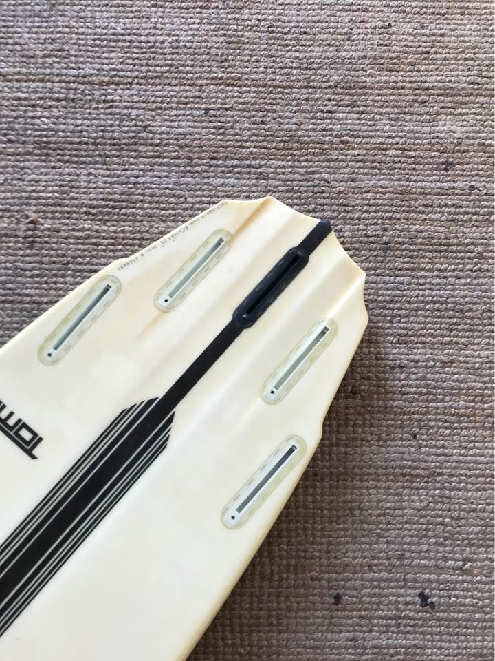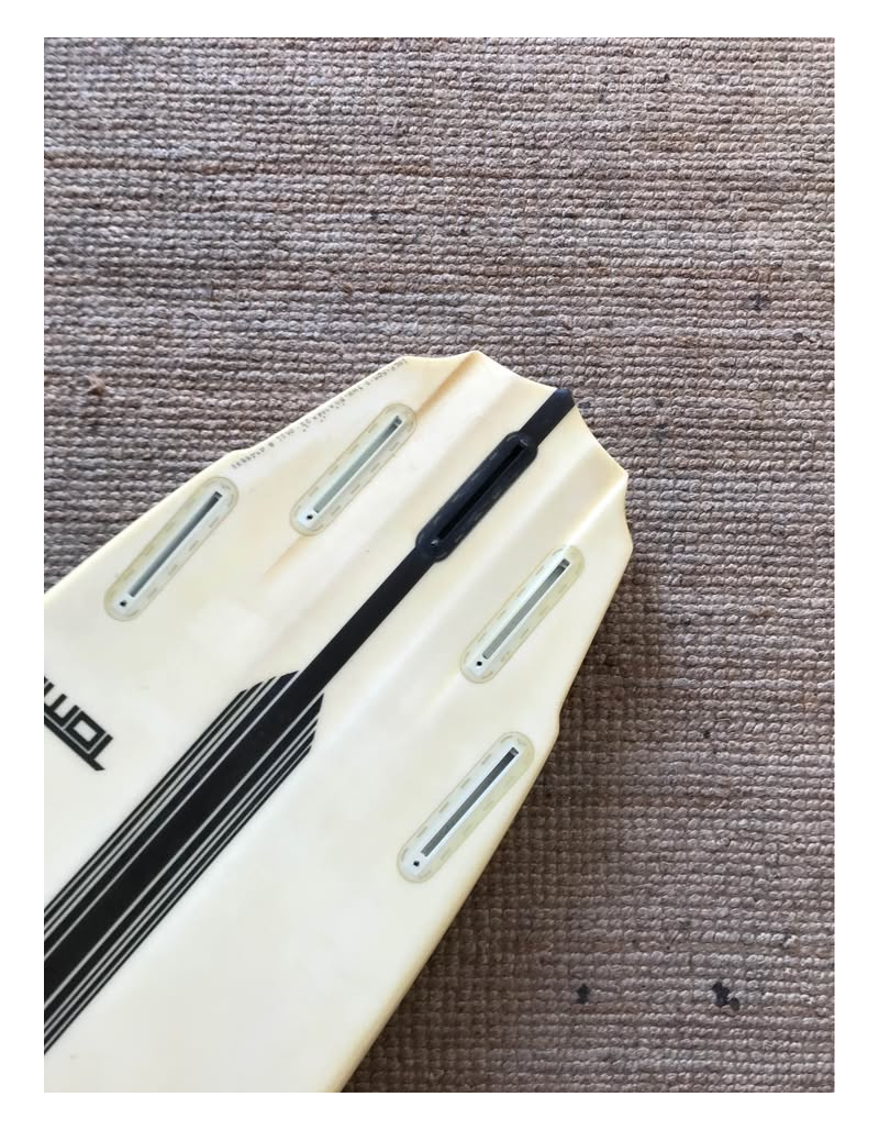 Planche surfée, avec enfoncements d'usage et réparations mineures