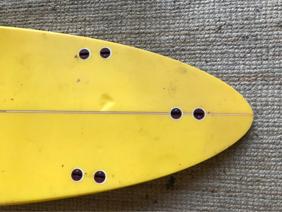 Planche surfée, avec enfoncements d'usage et réparations mineures