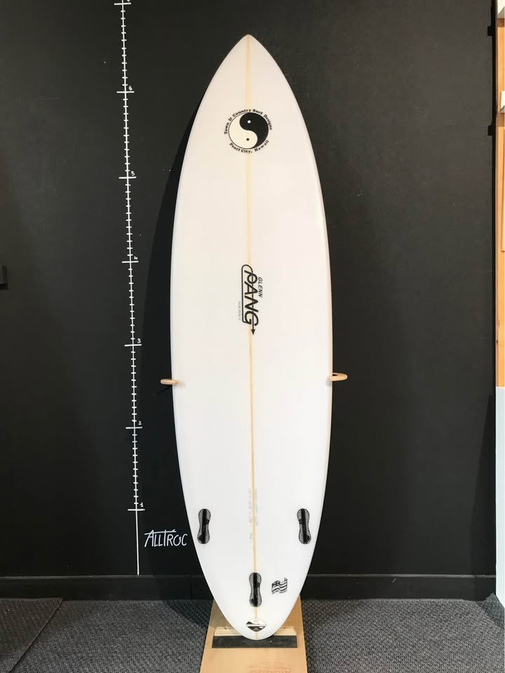 Planche surfée, avec enfoncements d'usage et réparations mineures