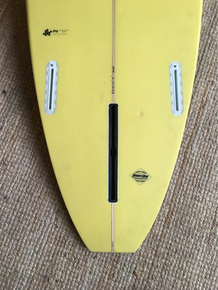 Planche surfée, avec enfoncements d'usage et réparations mineures