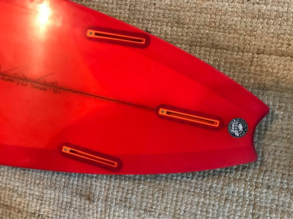 Planche surfée, avec enfoncements d'usage et réparations mineures