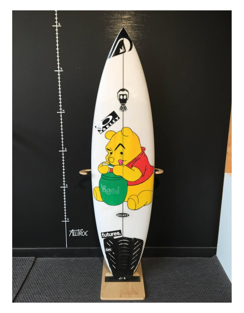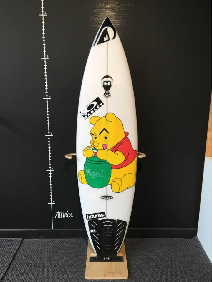 Planche surfée, avec enfoncements d'usage et réparations mineures