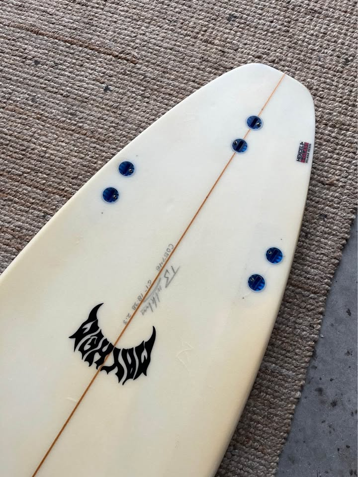 Planche surfée, avec enfoncements d'usage et réparations mineures