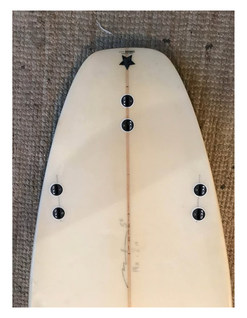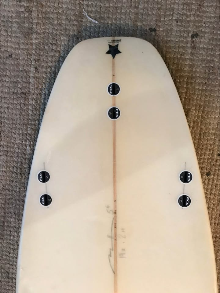 Planche surfée, avec enfoncements d'usage et réparations mineures