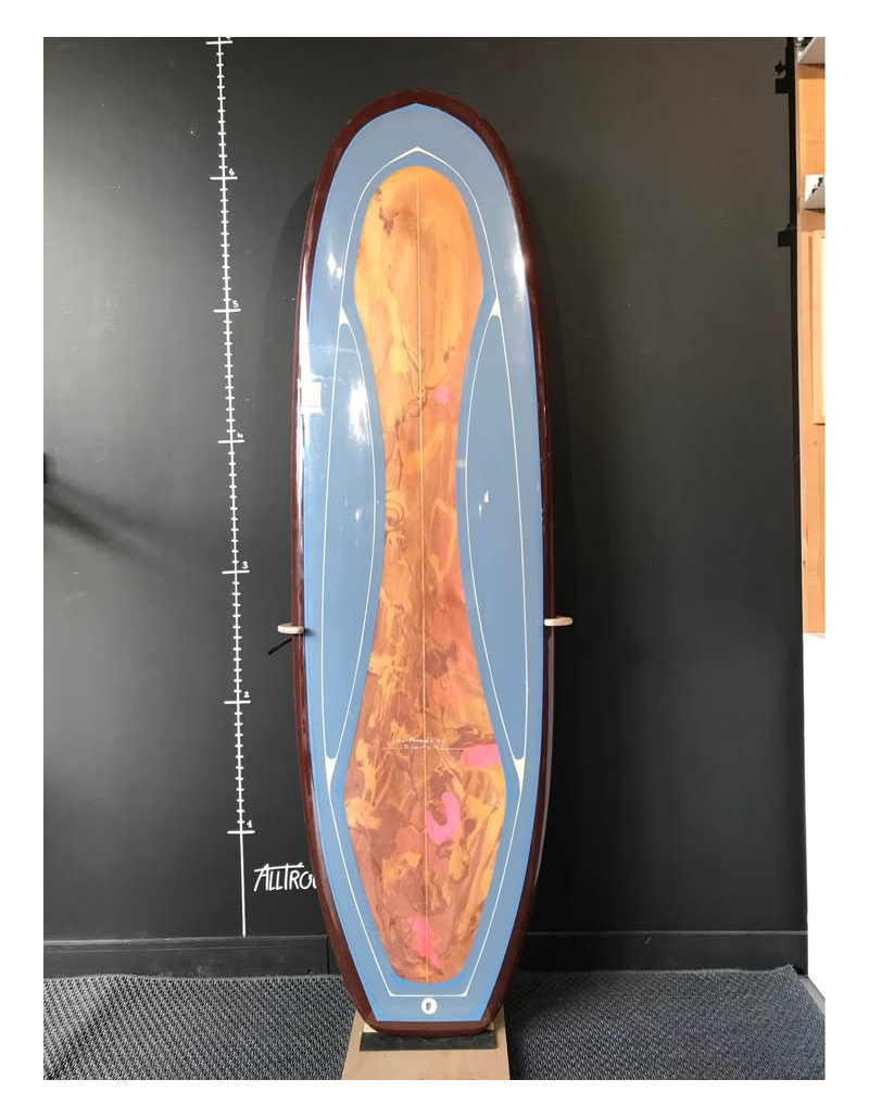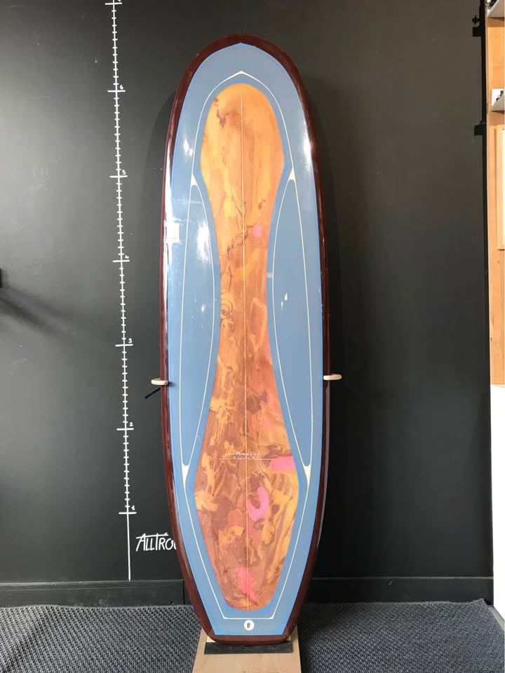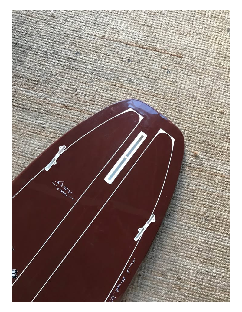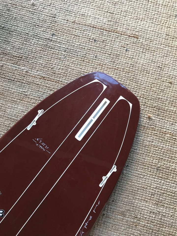 Planche surfée, avec enfoncements d'usage et réparations mineures