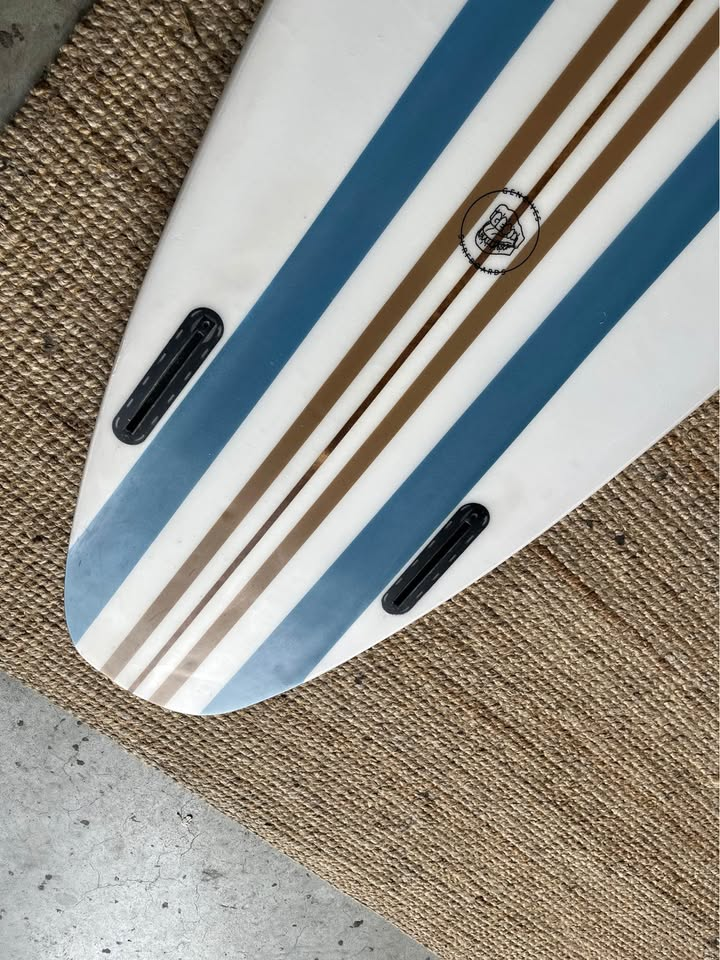 Planche surfée, avec enfoncements d'usage et réparations mineures