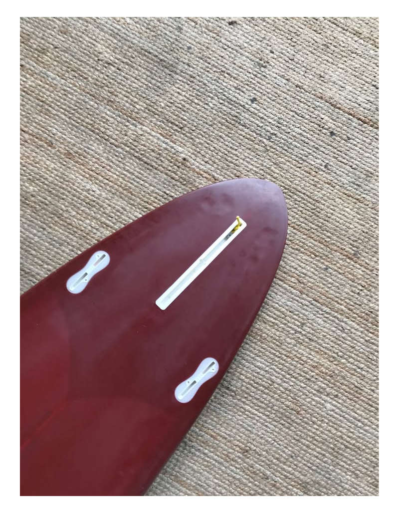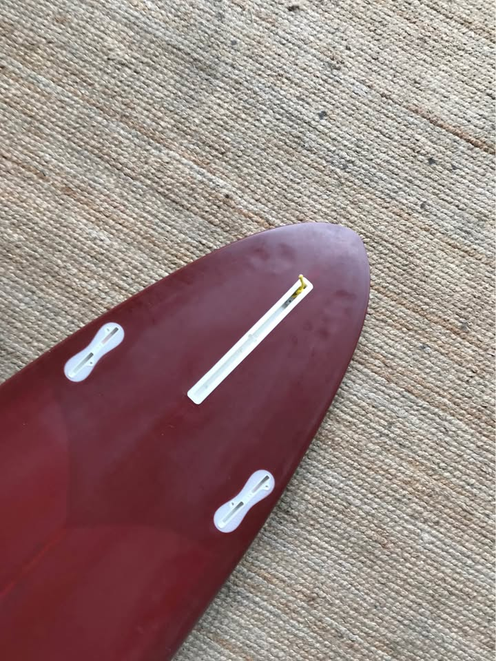 Planche surfée, avec enfoncements d'usage et réparations mineures