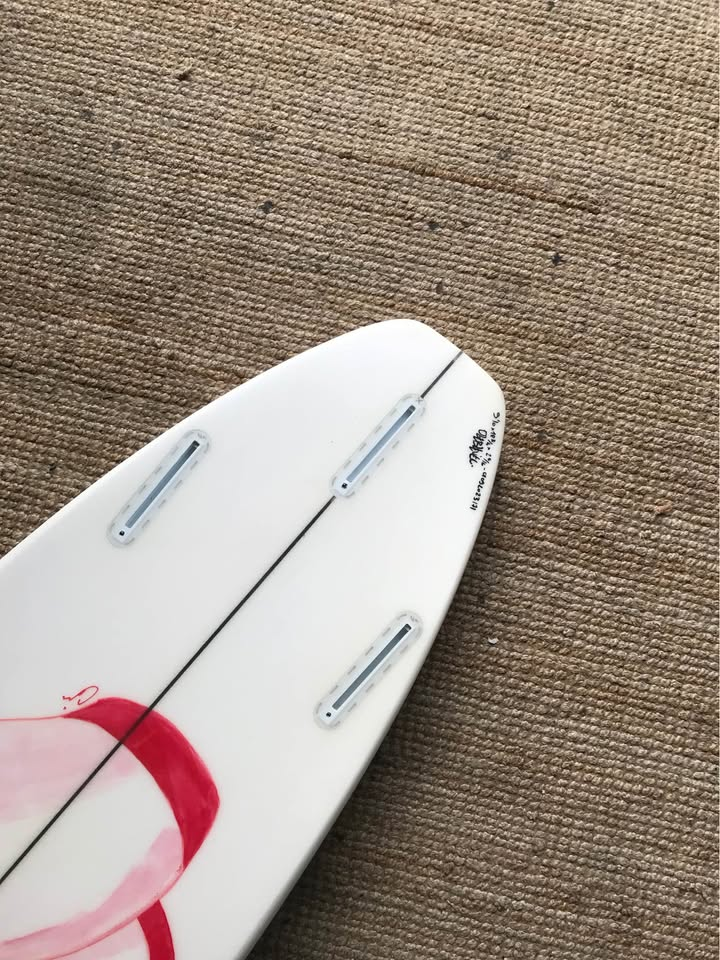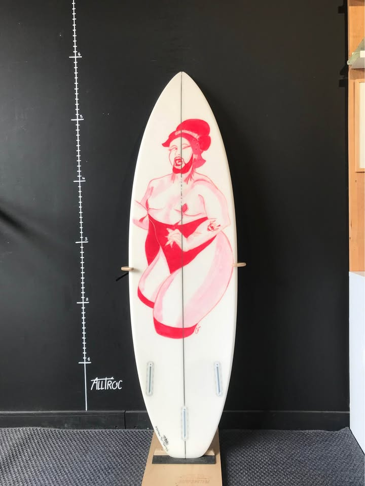 Planche surfée, avec enfoncements d'usage et réparations mineures
