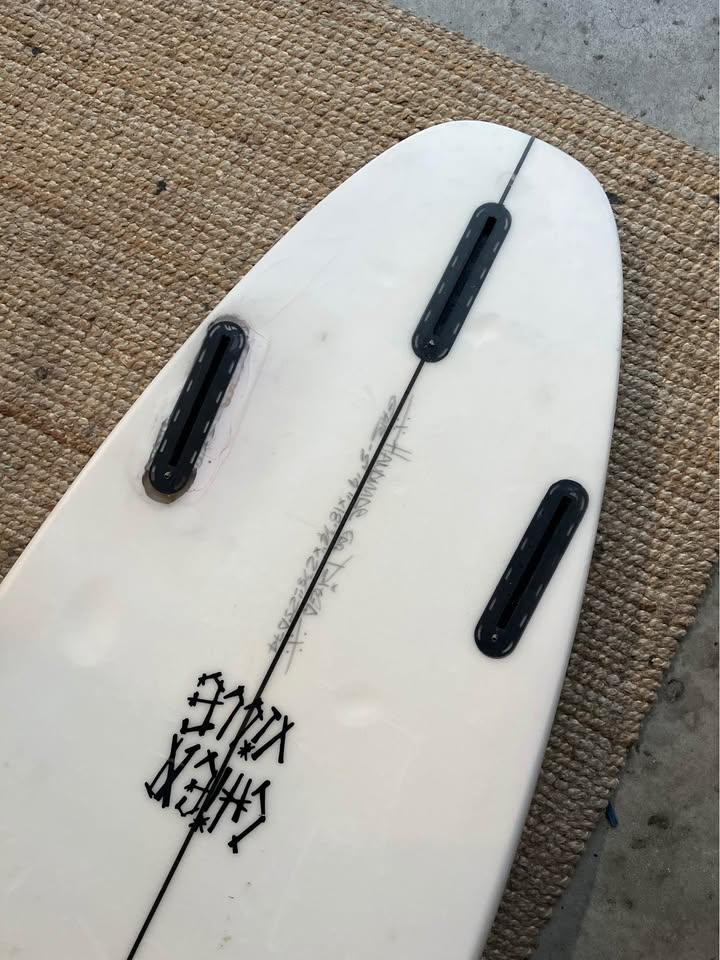 Planche bien surfée, avec enfoncements d'usage et réparations majeures