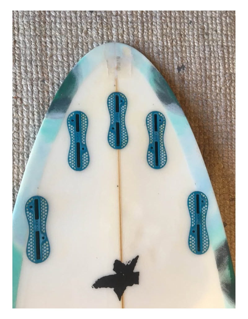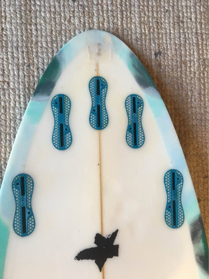 Planche bien surfée, avec enfoncements d'usage et réparations majeures