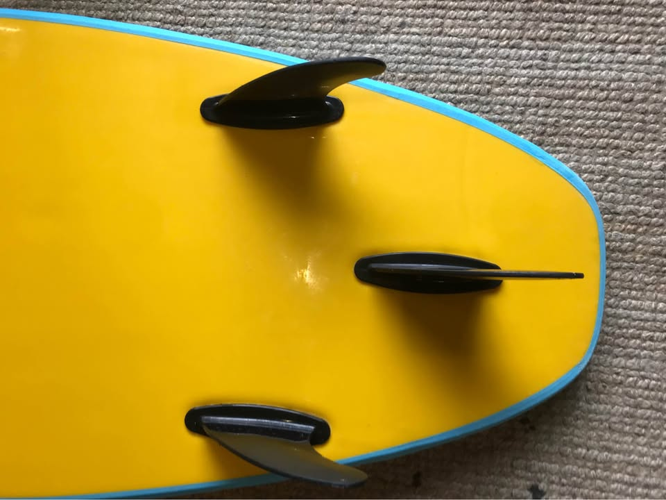 Planche bien surfée, avec enfoncements d'usage et réparations majeures