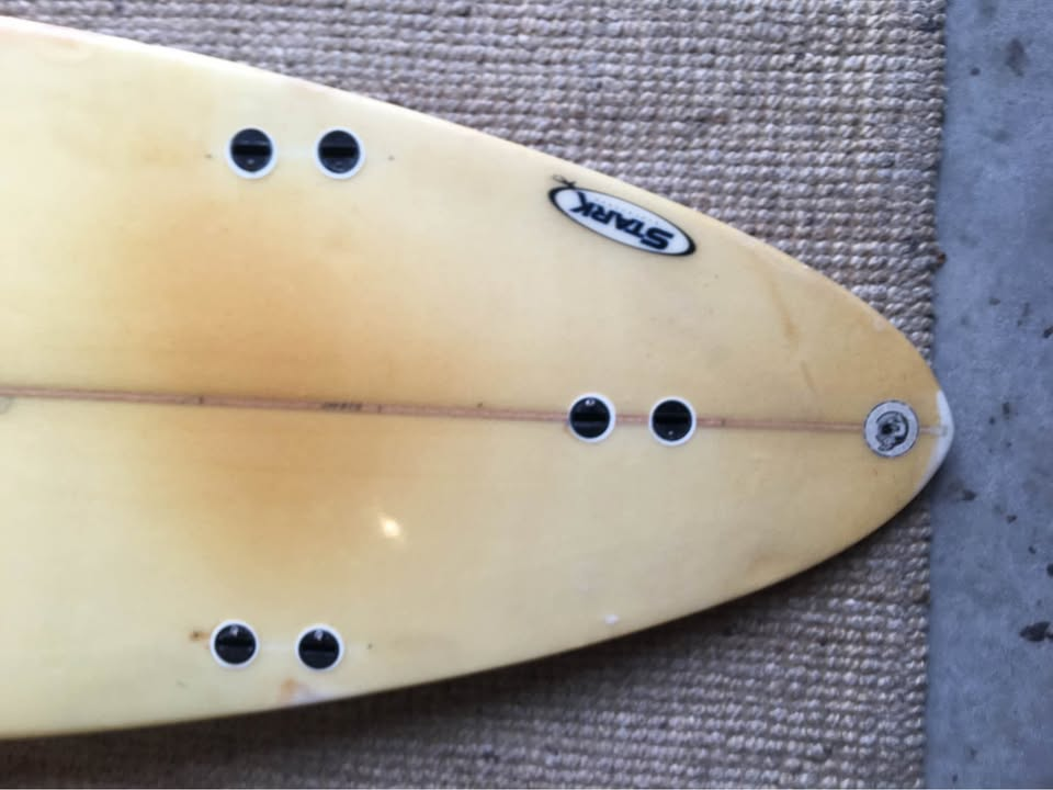 Planche bien surfée, avec enfoncements d'usage et réparations majeures