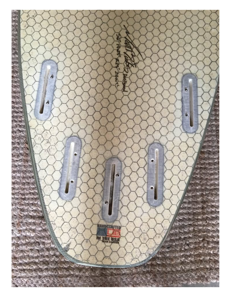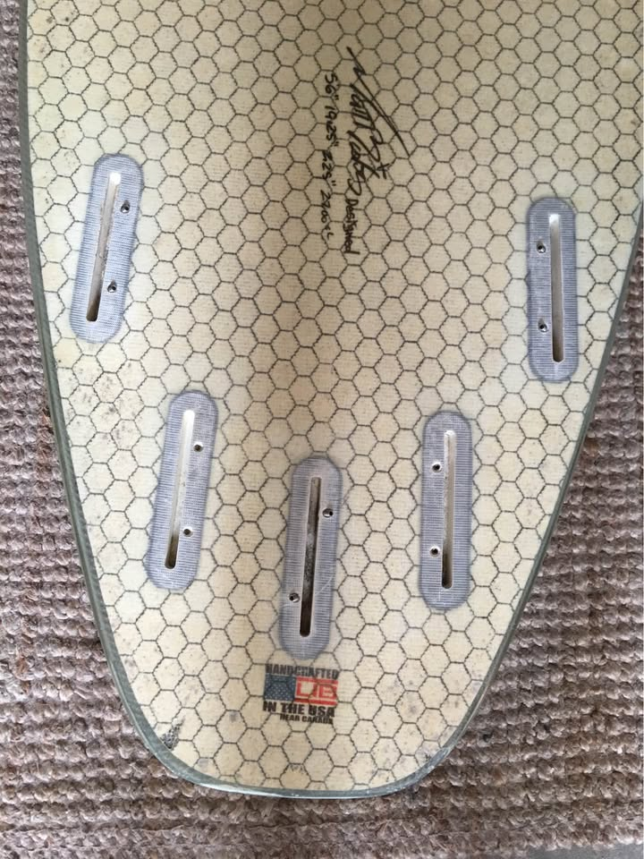 Planche bien surfée, avec enfoncements d'usage et réparations majeures