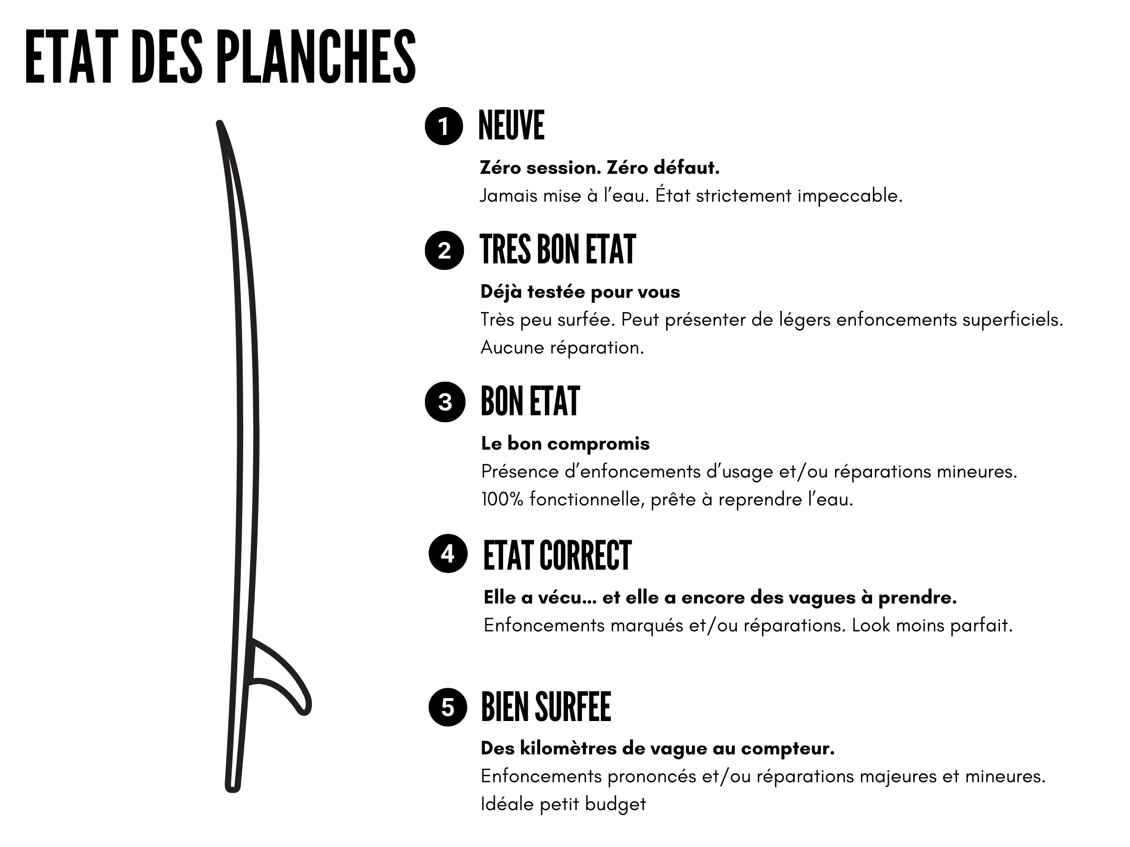 Acheter une planche d’occasion, c’est souvent le meilleur moyen de surfer plus… sans exploser son budget. Mais encore faut-il savoir lire entre les lignes. Chez Alltroc, on a fait simple : 5 niveaux d’état, clairs et transparents, pour que vous sachiez exactement ce que vous achetez.
